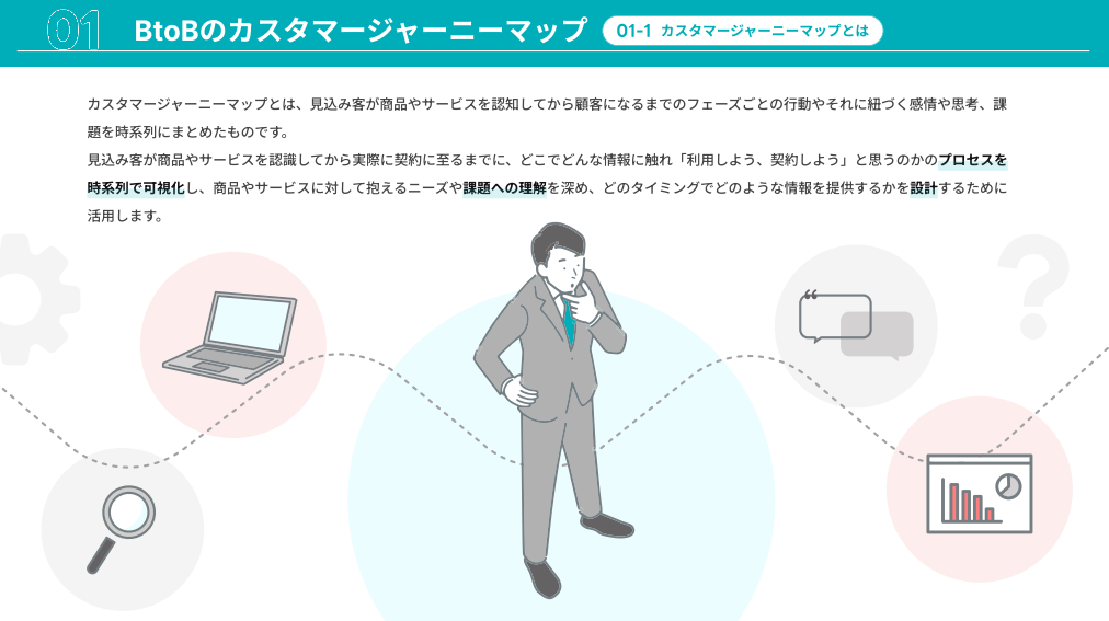 顧客が商品やサービスを認知してから契約に至るまでの行動・感情・課題を時系列で可視化するフレームワーク。