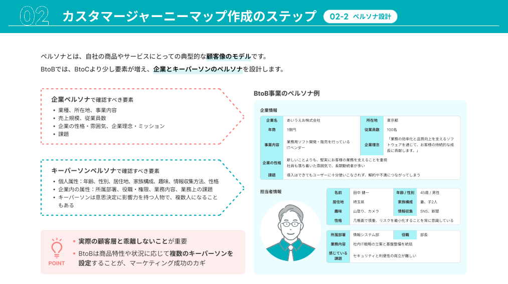 そのため、「担当者」「決裁者」「利用者」など複数のペルソナ設定と、それぞれの課題・目的を明確化することが鍵となります。