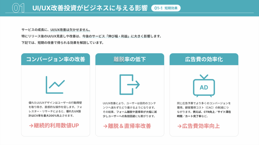 UI/UX改善は単なるデザイン施策ではなく、事業の収益性を高めるための経営投資です。